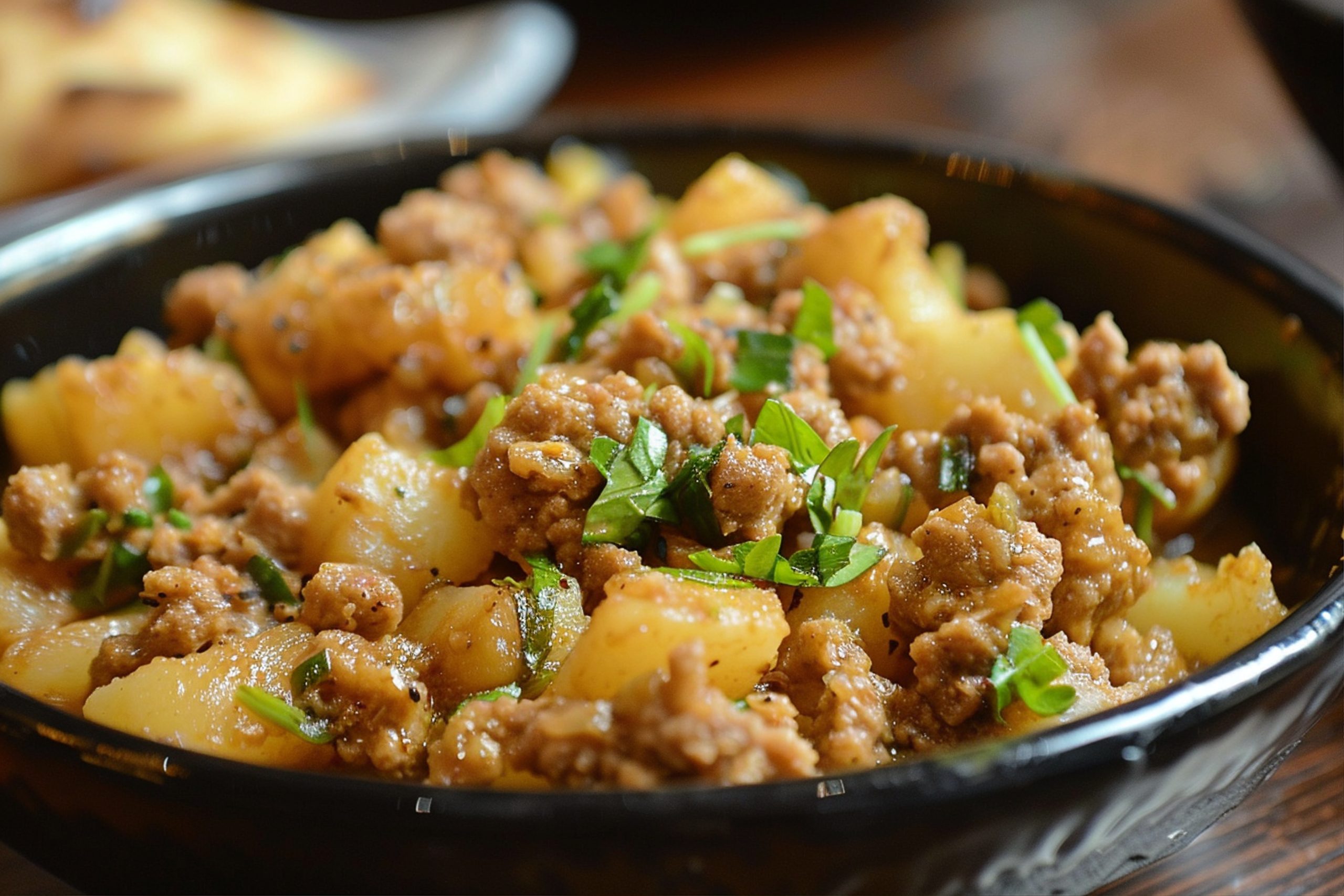 Bước 4: Vẫn sử dụng chảo đó, phi thơm hành tím băm, cho khoai tây vào xào với chút hạt nêm, để lửa vừa và nhỏ để khoai không bị nát, sau đó thêm phần thịt xay vào xào cùng, nêm nếm lại cho vừa ăn, thêm hành lá, vậy là món ăn đã hoàn thành.