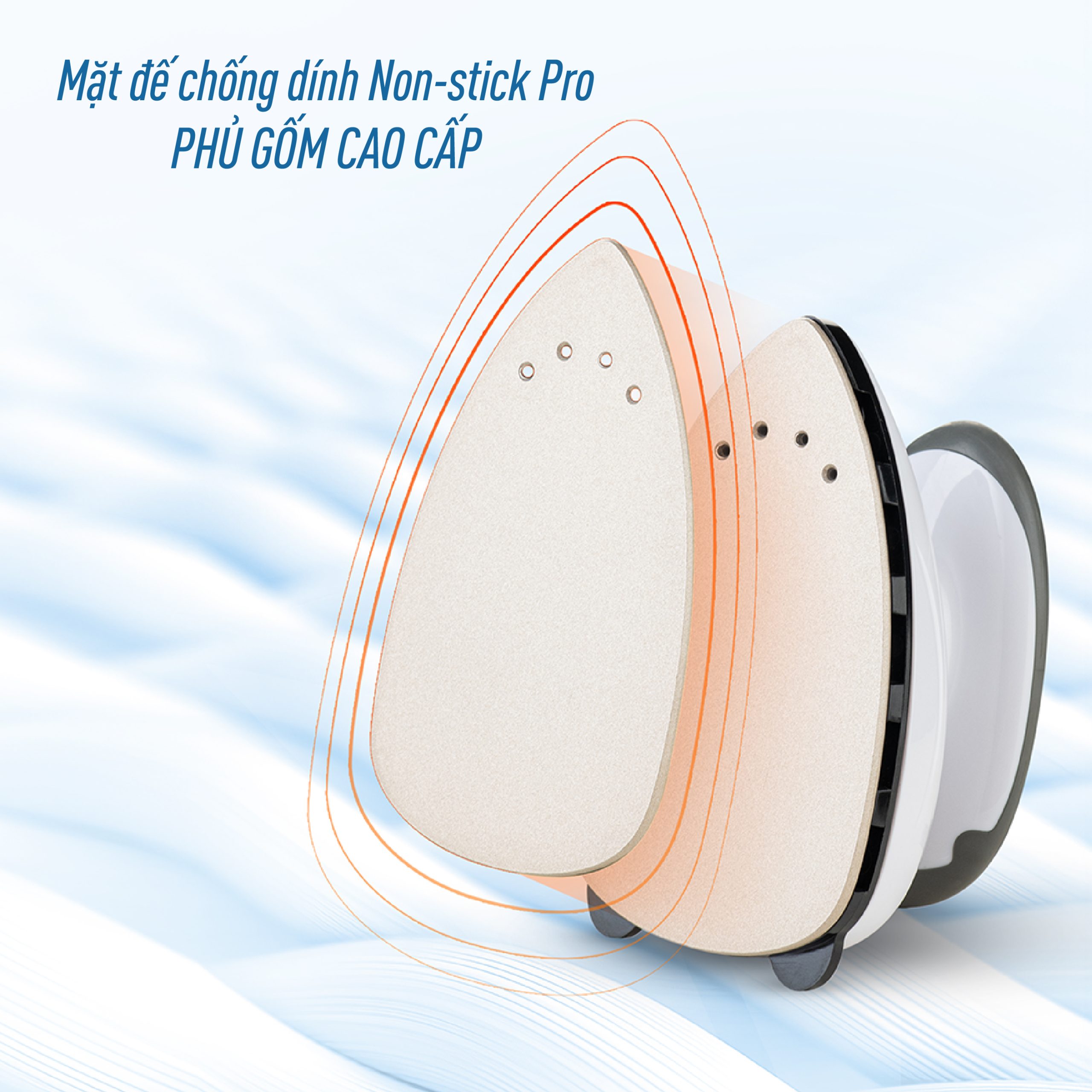 – Mặt đế chống dính Non-stick Pro phủ gốm cao cấp, chống trầy xước, lướt êm ái trên mọi mặt vải, bảo vệ quần áo tối ưu
