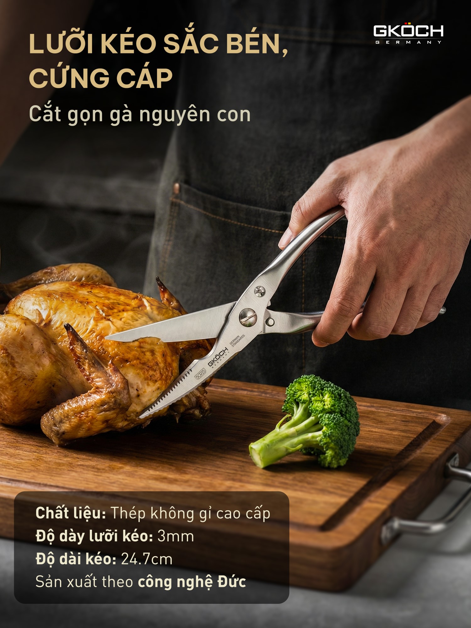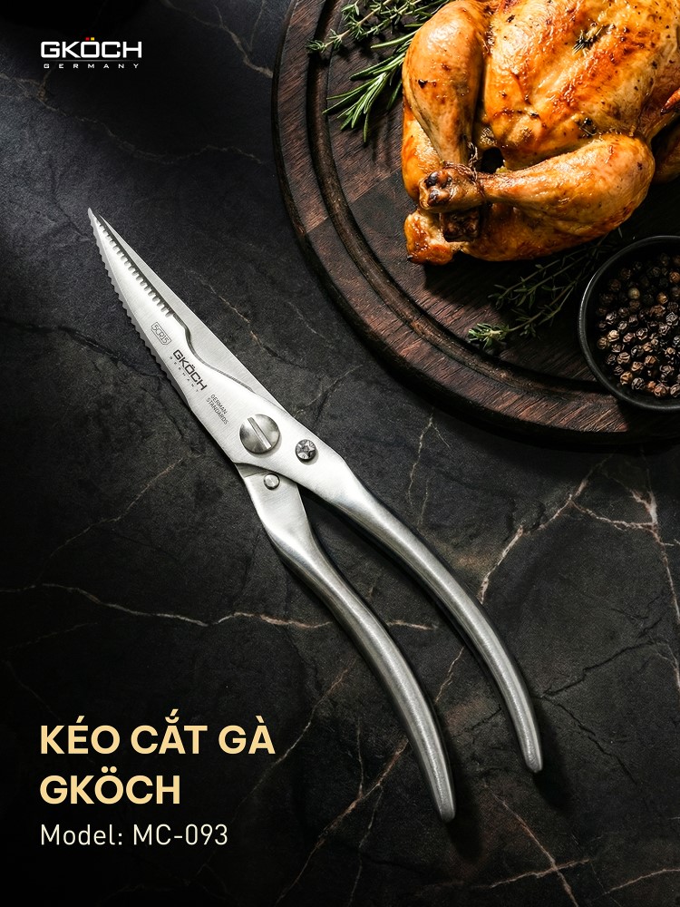 Kéo cắt gia cầm GKÖCH – Model MC-093 là dụng cụ nhà bếp chuyên dụng giúp việc chia nhỏ gà và gia cầm trở nên nhanh gọn, chính xác và an toàn hơn. Với lưỡi kéo sắc bén, cứng cáp cùng thiết kế trợ lực thông minh, sản phẩm cho phép thao tác nhẹ tay, ổn định ngay cả khi xử lý gà nguyên con.