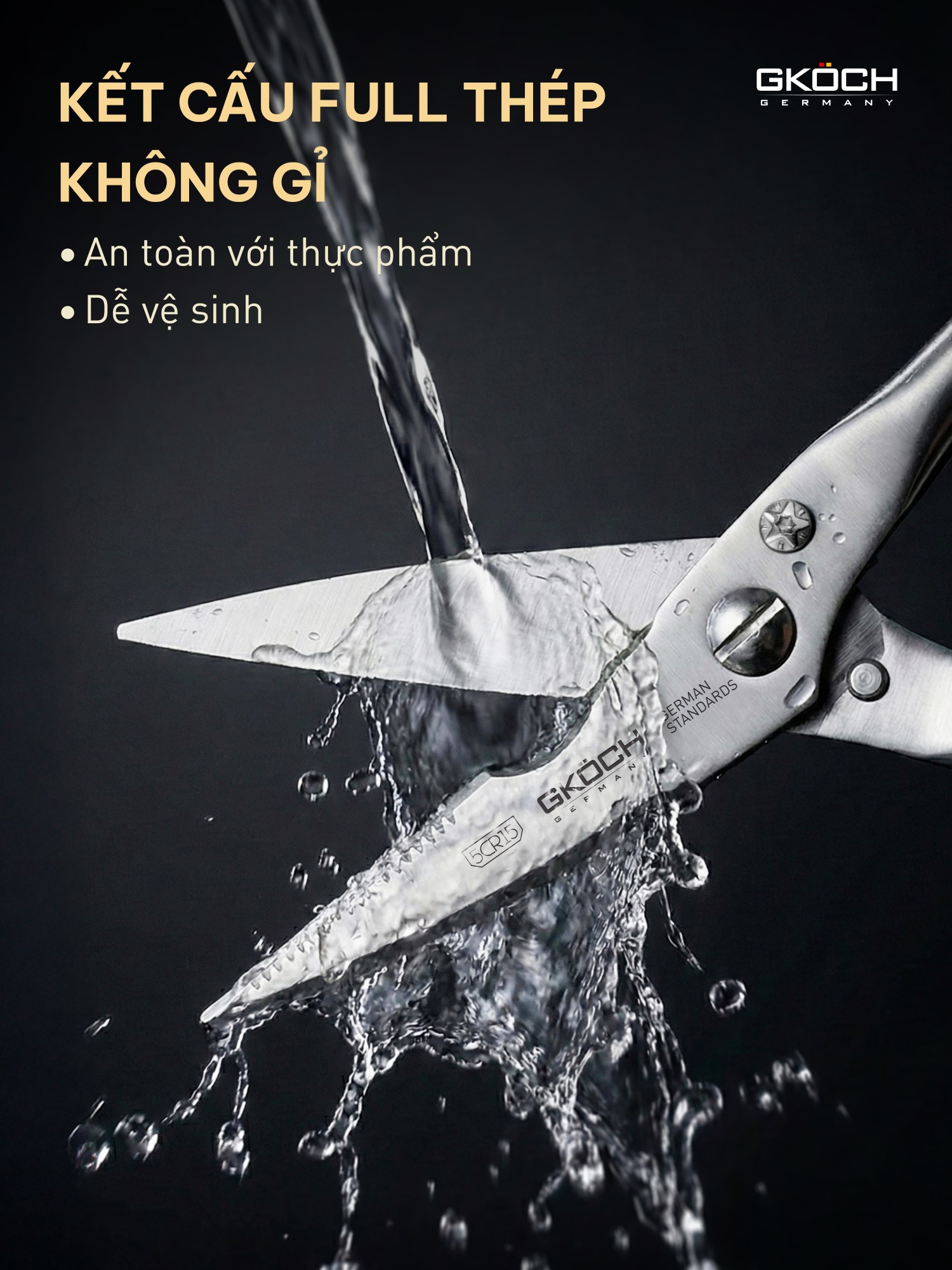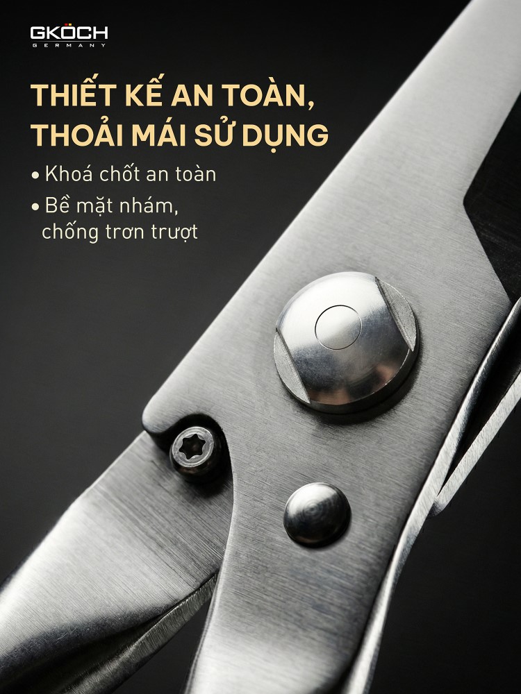 Sở hữu kết cấu full thép không gỉ cao cấp cùng độ dày lưỡi 3 mm, kéo cắt gia cầm GKÖCH đảm bảo độ bền lâu dài, an toàn khi tiếp xúc thực phẩm và dễ dàng vệ sinh sau mỗi lần sử dụng. Thiết kế công thái học kết hợp khóa chốt an toàn giúp người dùng yên tâm khi sử dụng và cất giữ trong gian bếp hàng ngày.