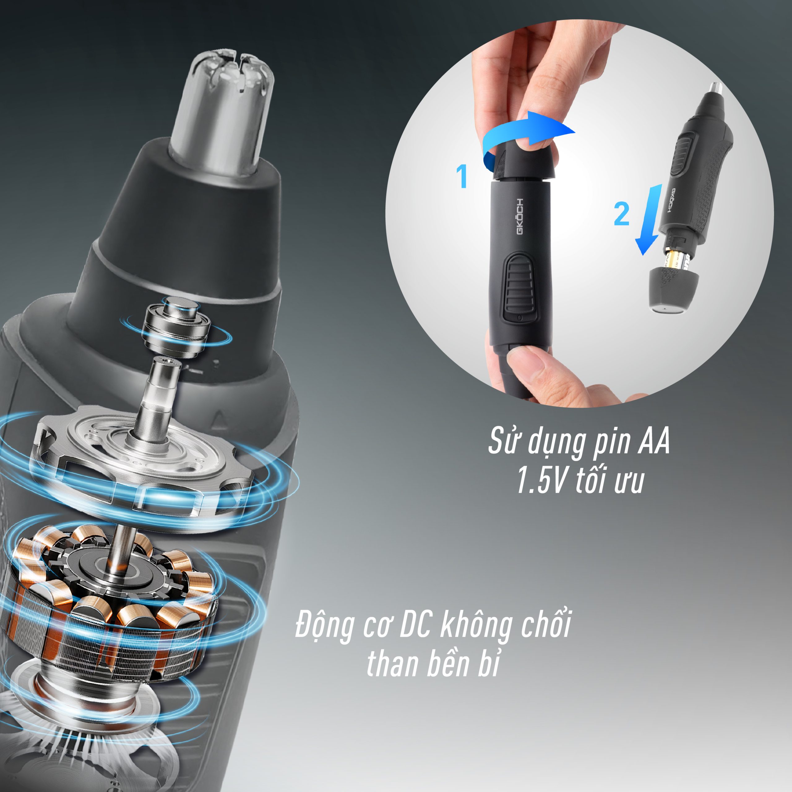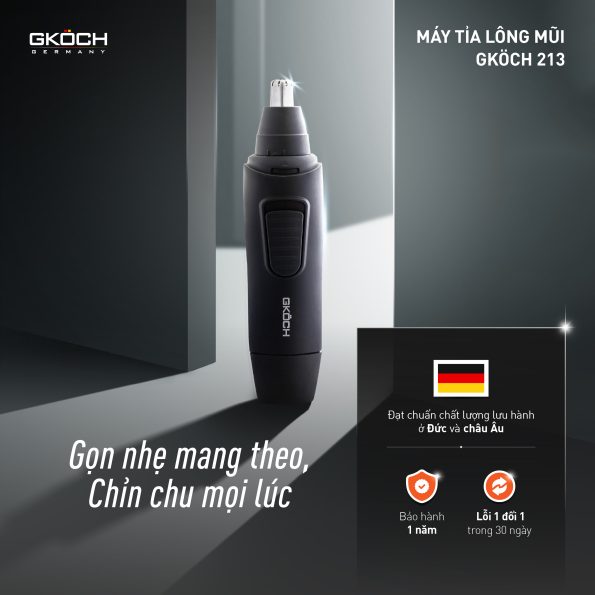 “Máy tỉa lông mũi GKÖCH 213 giúp bạn loại bỏ lông mũi thừa một cách nhẹ nhàng, nhanh chóng, để bạn luôn gọn gàng và tự tin trong mọi tình huống.