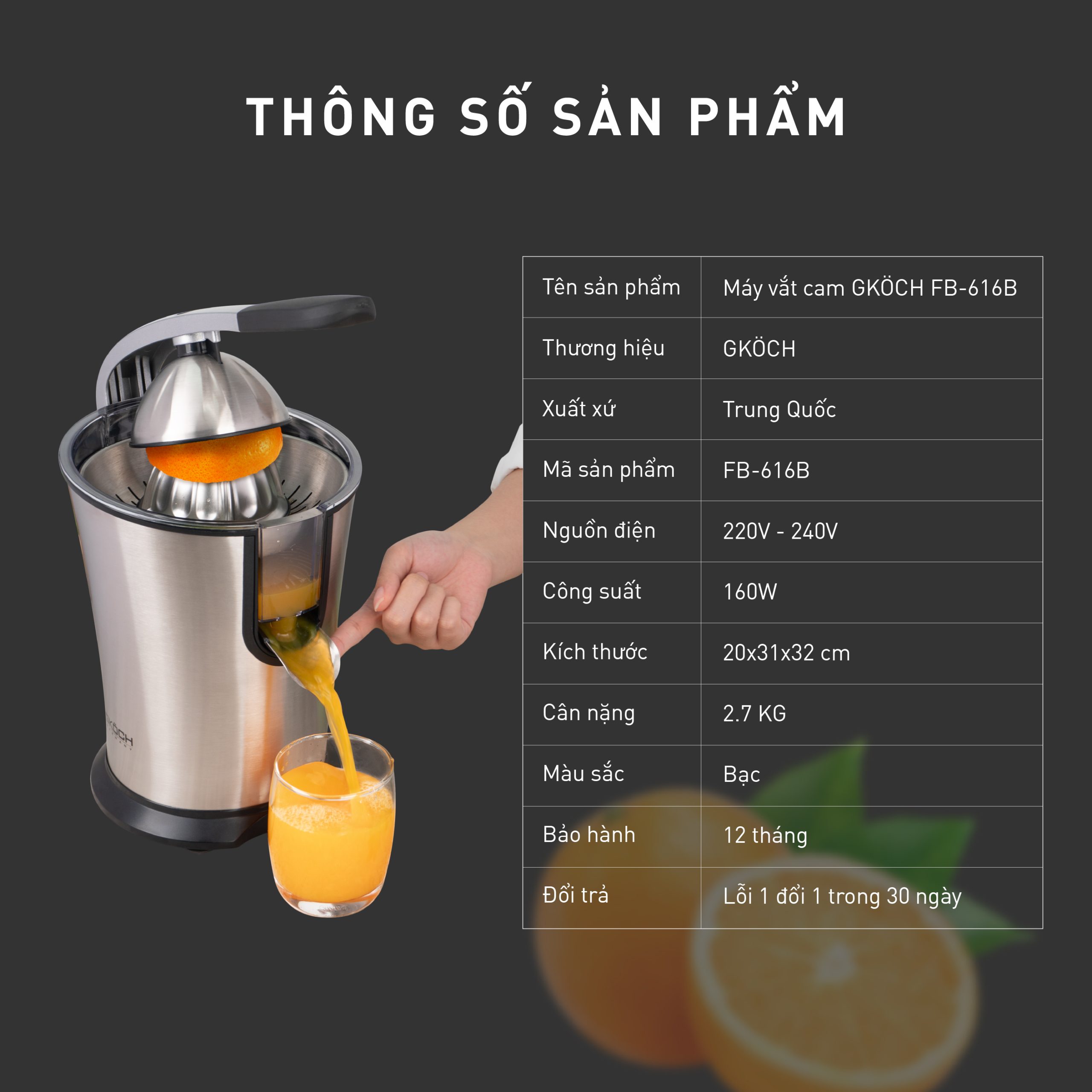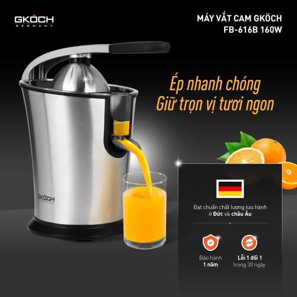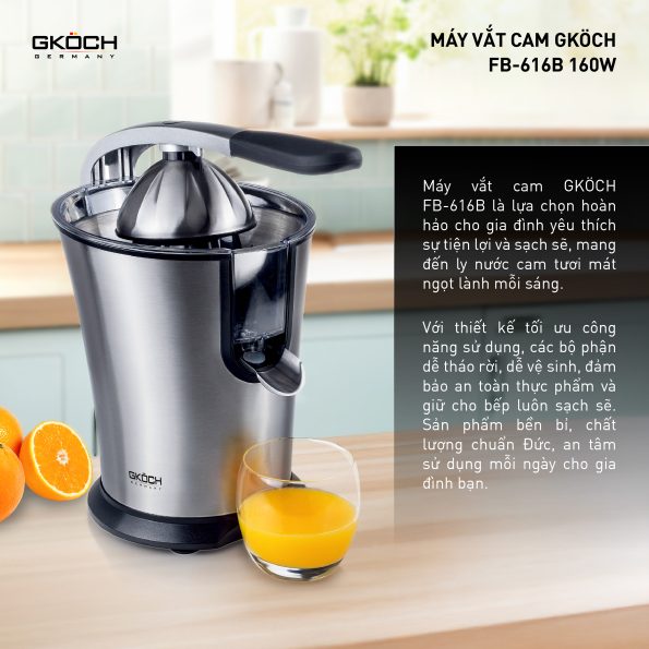 Máy vắt cam GKÖCH FB-616B là lựa chọn hoàn hảo cho gia đình yêu thích sự tiện lợi và sạch sẽ, mang đến ly nước cam tươi mát ngọt lành mỗi sáng.